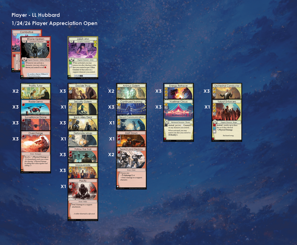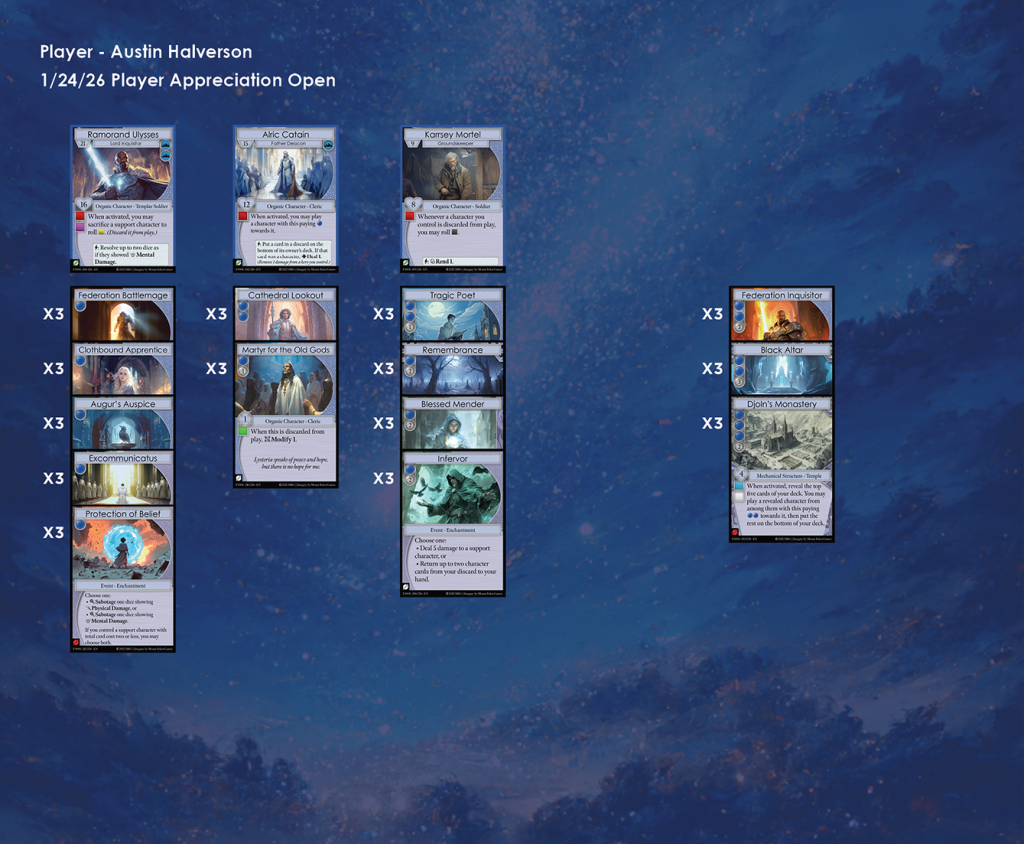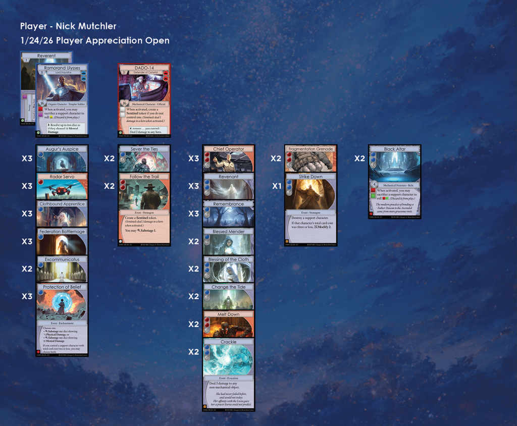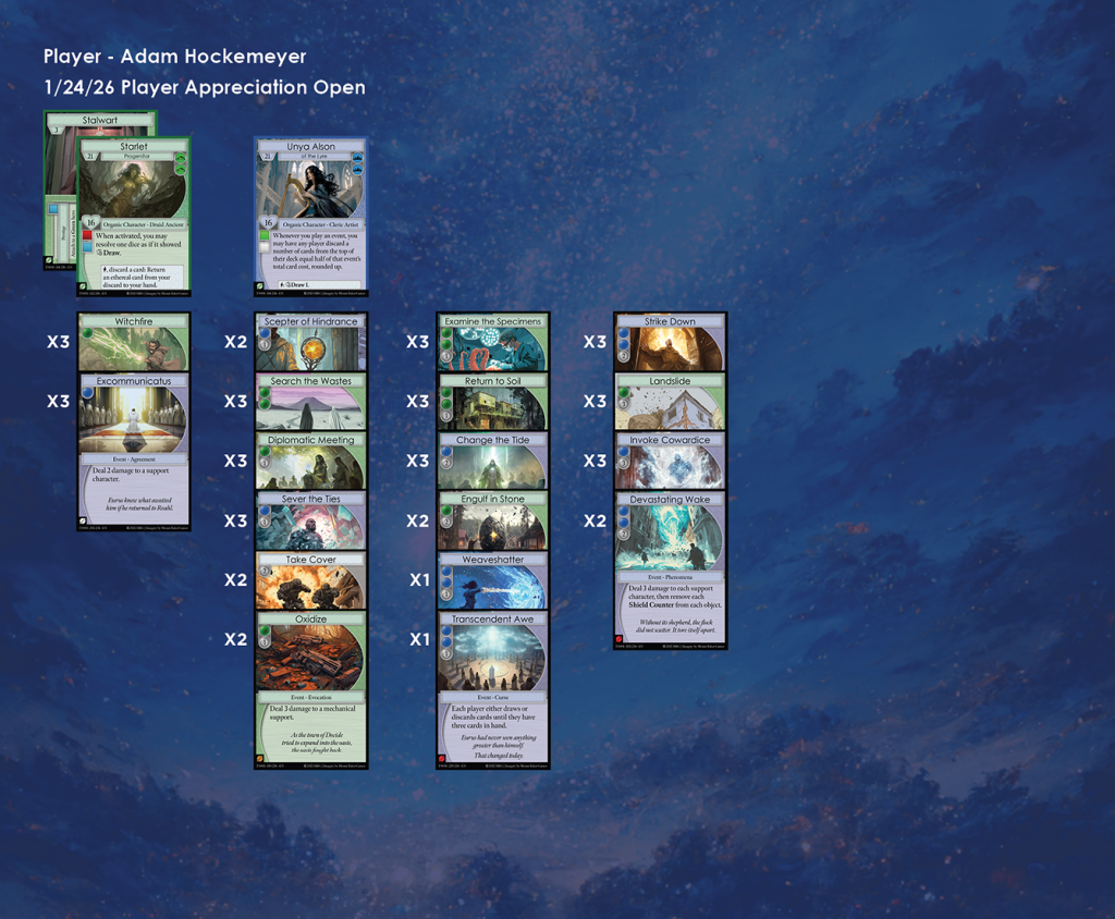 Discordia Games in Bremerton was the host of the second Manifold TCG Player Appreciation Open of Season 1. There were 8 participants in this event, and here we have each of their lists. A metagame analysis for the event can be found here.