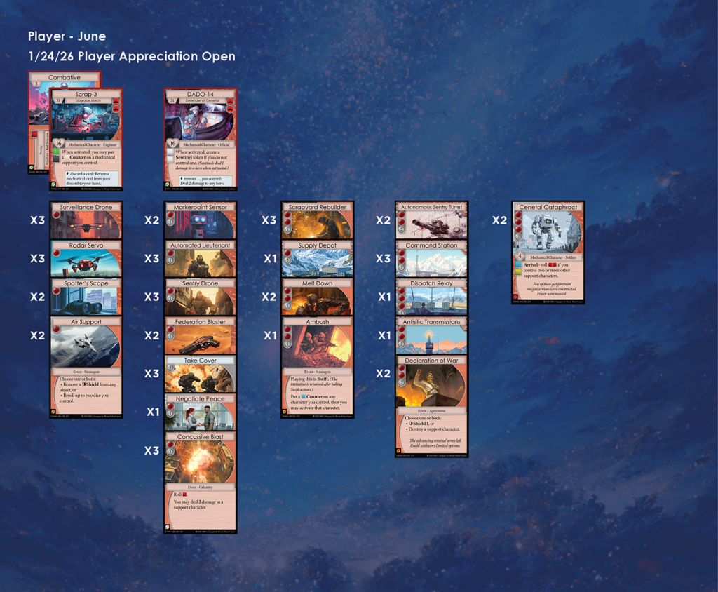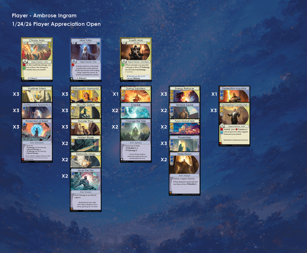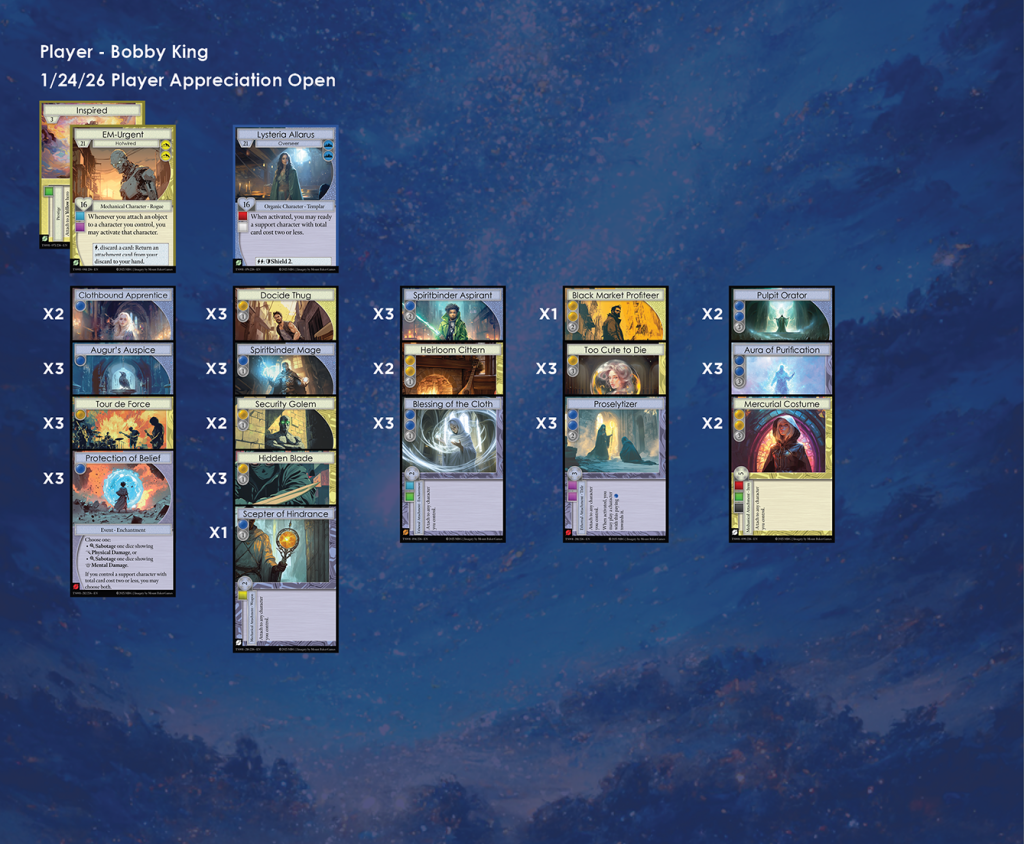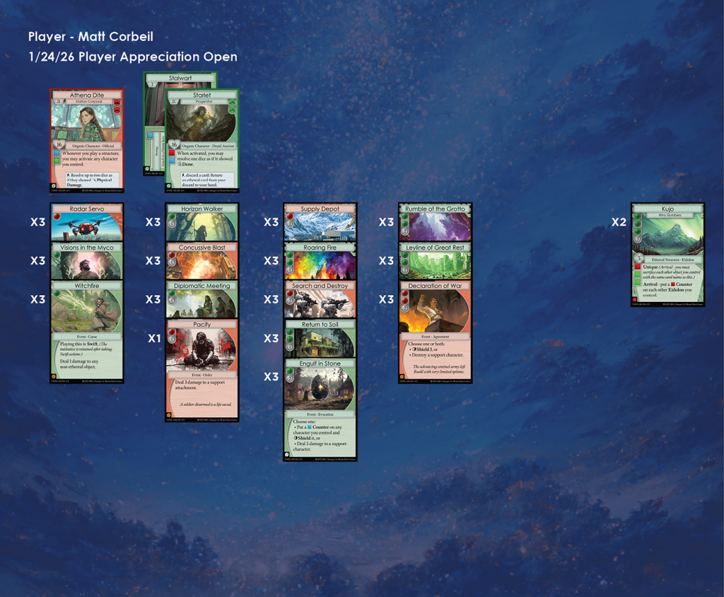 Discordia Games in Bremerton was the host of the second Manifold TCG Player Appreciation Open of Season 1. There were 8 participants in this event, and here we have each of their lists. A metagame analysis for the event can be found here.